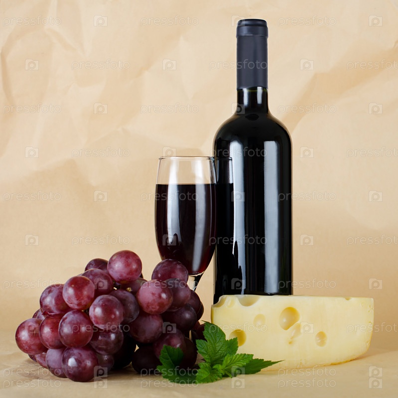 Красное вино, виноград и сыр на бумажном фоне