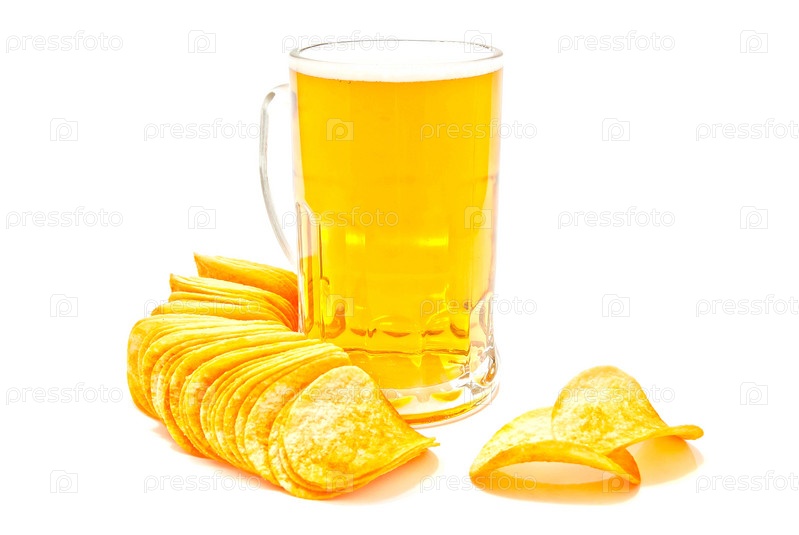 Чипсы и пиво в стеклянной кружке