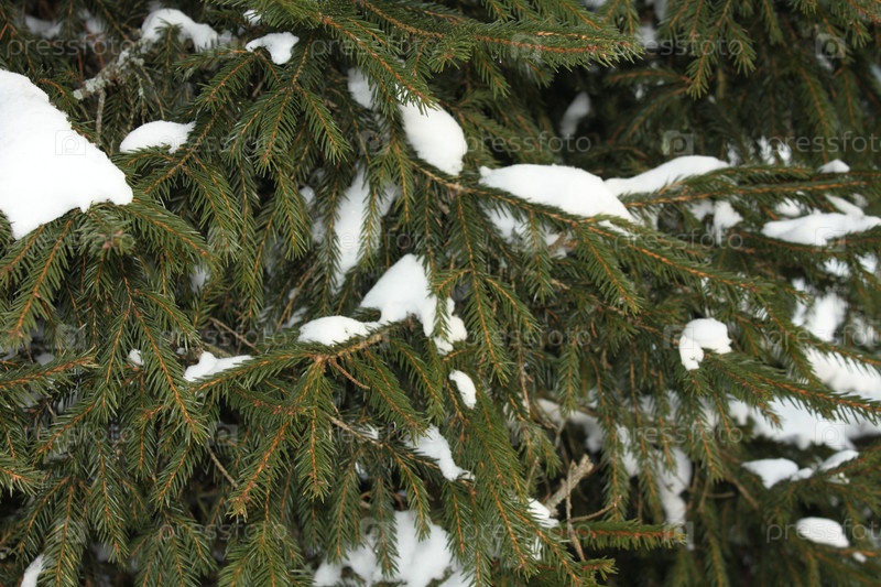 Зелёная ветвь елей в зимнее время на снегу