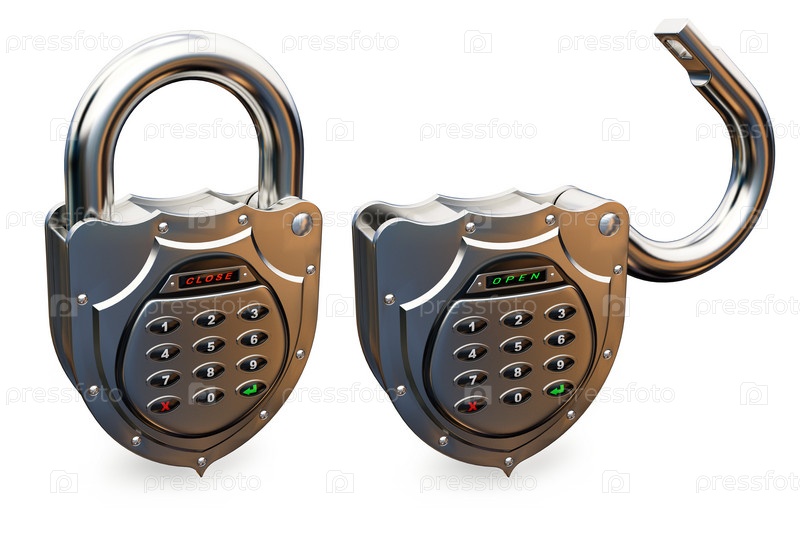 Закрытый и открытый навесные кодовые замки на белом фоне