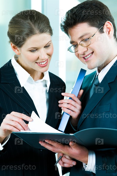 Вертикальное изображение двух бизнесменов, которые смотрят на документы и обсуждают их