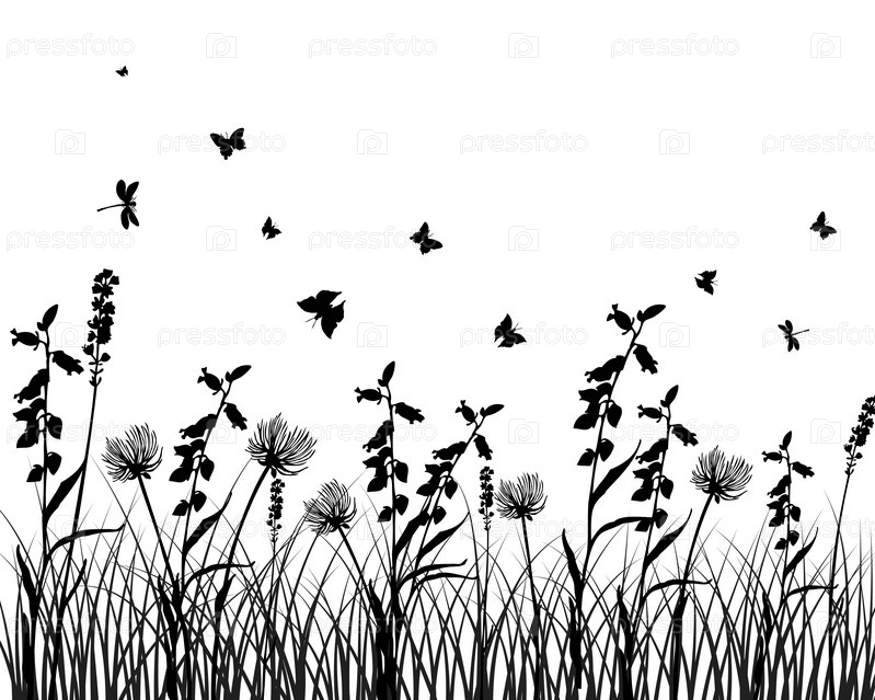 Силуэт травы и летающих бабочек на белом фоне