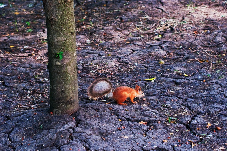 Белка, сидящая на земле рядом с деревом