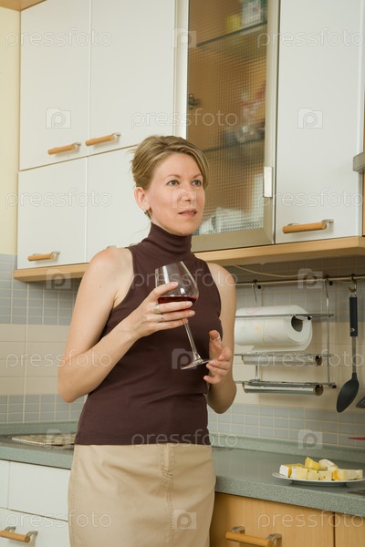 Женщина с бокалом вина и сыром на кухне
