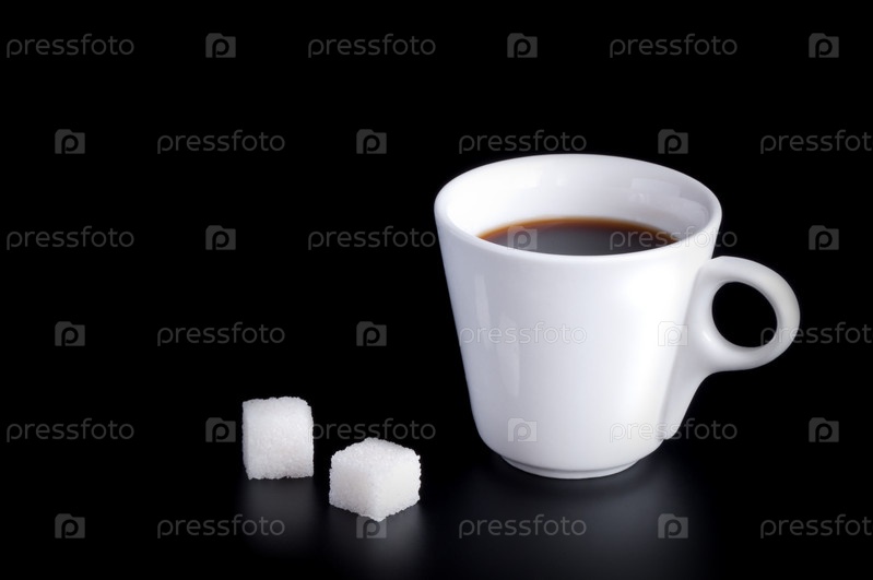 Белая чашка кофе и кубики сахара изолированы на черном фоне