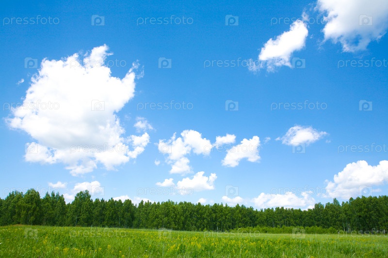 Фото яркого облачного неба с красивым зеленым полем ниже