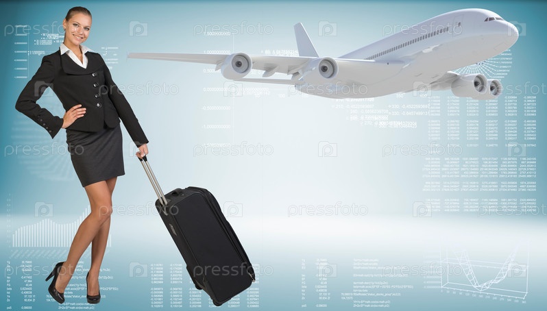 Бизнес-леди с чемоданом на фоне самолета