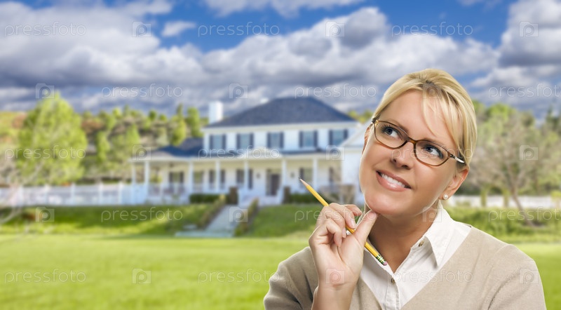Молодая женщина с карандашом напротив дома