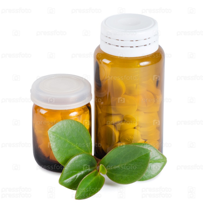 Пузырьки с таблетками и зеленая веточка, изолированные на белом фоне