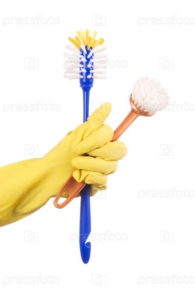 Ершик и щетка для мытья туалета в руке в резиновой перчатке