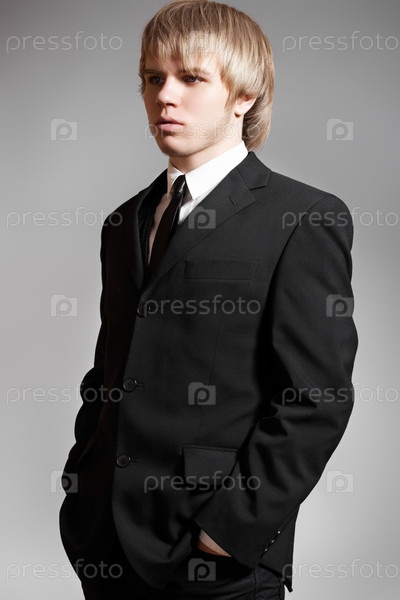 Молодой человек в деловом костюме на сером фоне