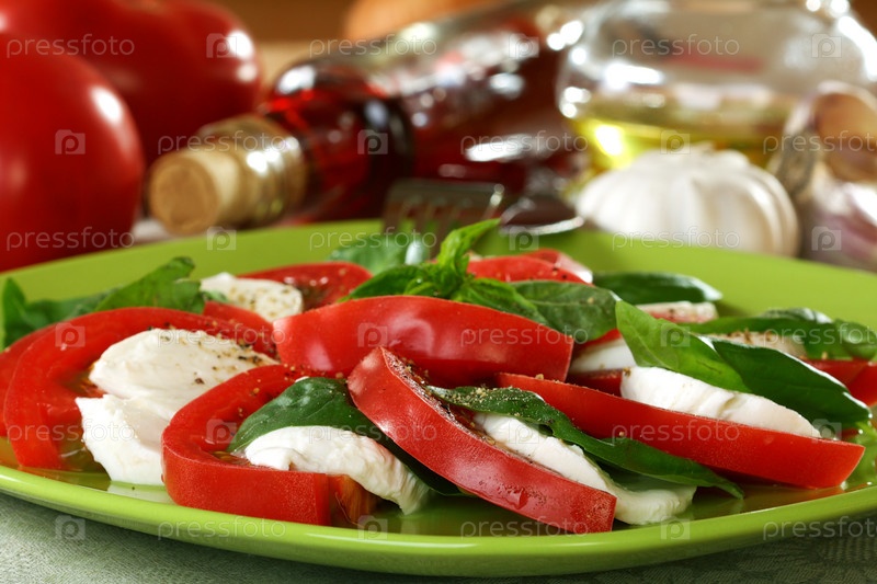 Салат Капрезе со свежими помидорами, базиликом и сыром на зеленой тарелке