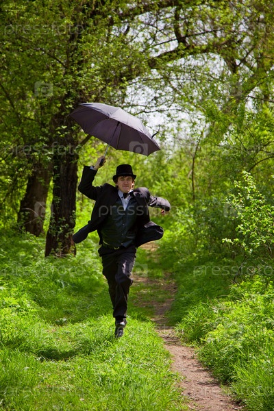 Мужчина бежит по летнему парку с зонтом
