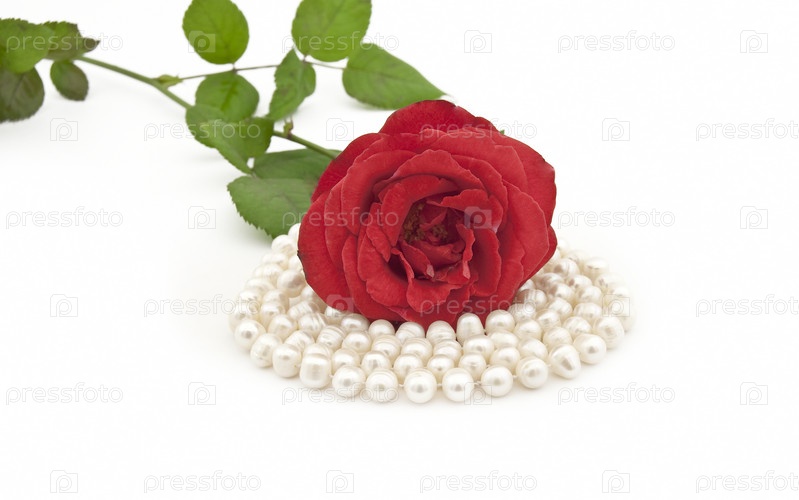 Красная роза с жемчужным ожерельем на белом фоне