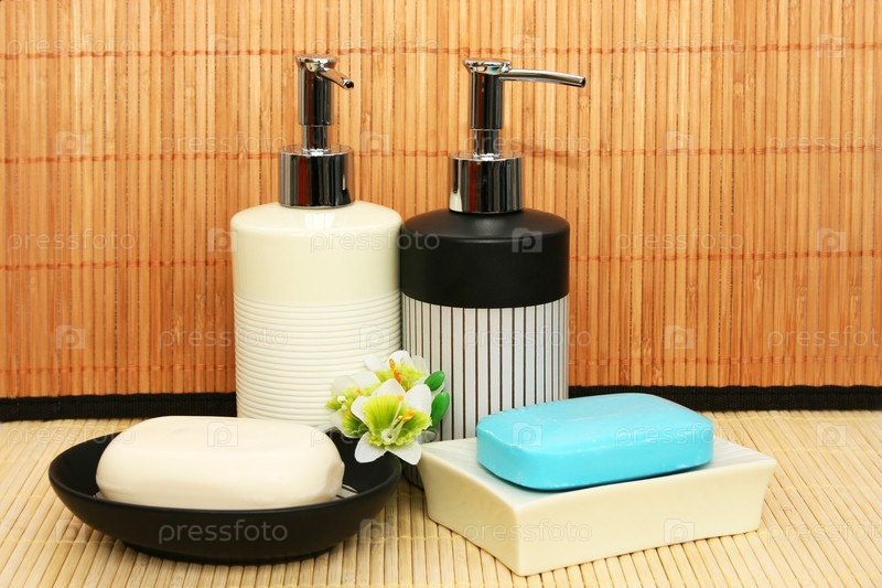 Жидкое и кусковое мыло на бамбуковом фоне
