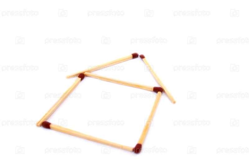 Спички, выложенные в форме дома на белом фоне