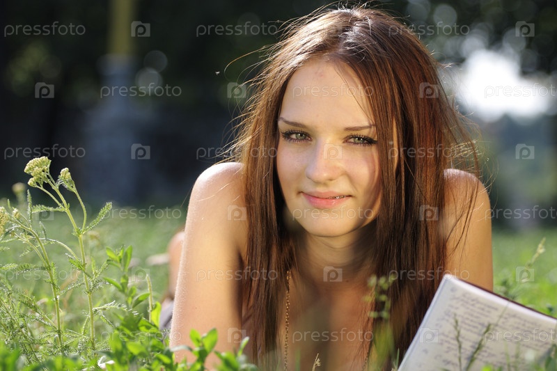Девушка с тетрадью лежит на траве