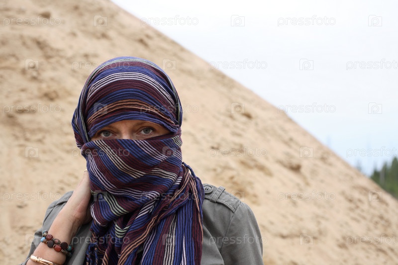 Восточная женщина в парандже на фоне песка и неба