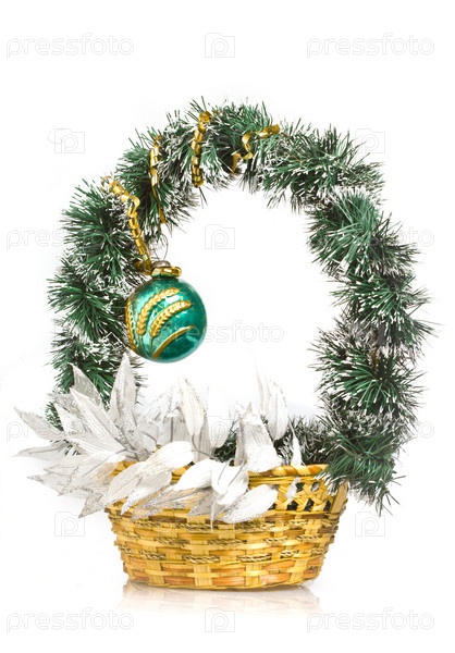 Декоративная новогодняя корзина с елочными игрушками на белом фоне