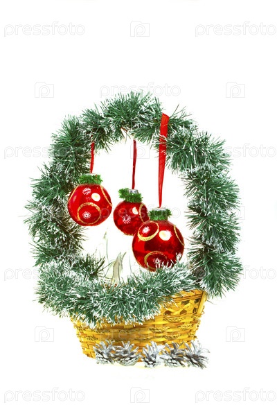Декоративная новогодняя корзина с елочными игрушками на белом фоне