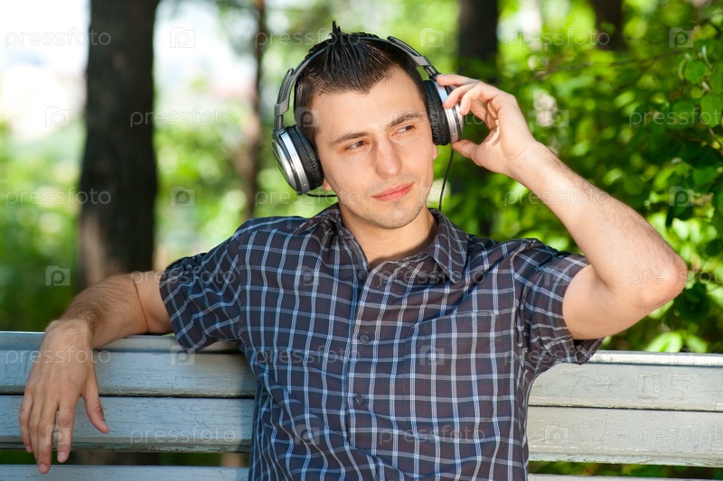 Парень сидит на скамейке в парке и слушает музыку