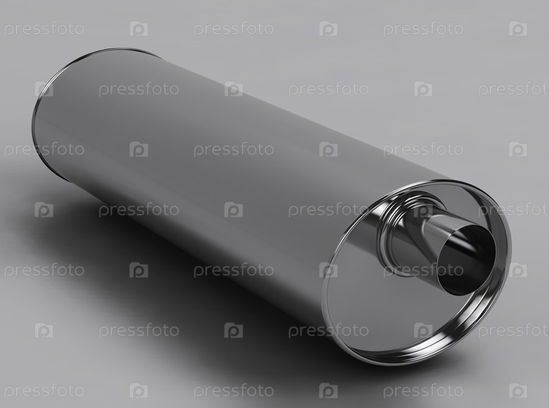 Блестящий стальной глушитель, 3D-графика на сером фоне