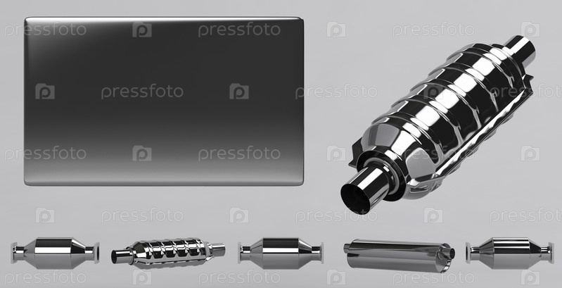 Коллекция глушителей и стальная табличка для текста, 3D-графика на сером фоне
