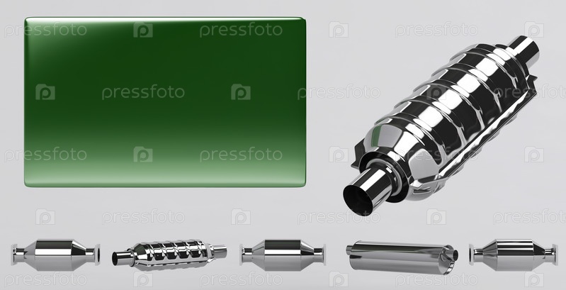 Коллекция глушителей и стальная табличка для текста, 3D-графика на сером фоне