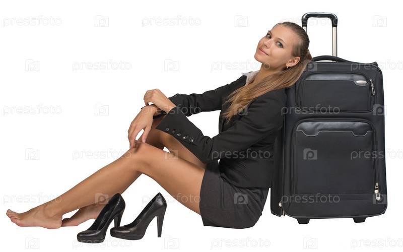 Бизнес-леди с чемоданом на белом фоне