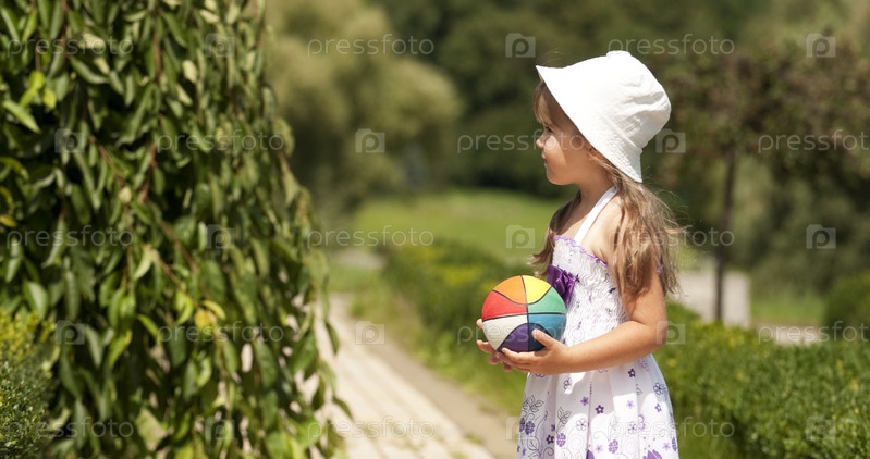 Маленькая девочка играет с мячом в парке