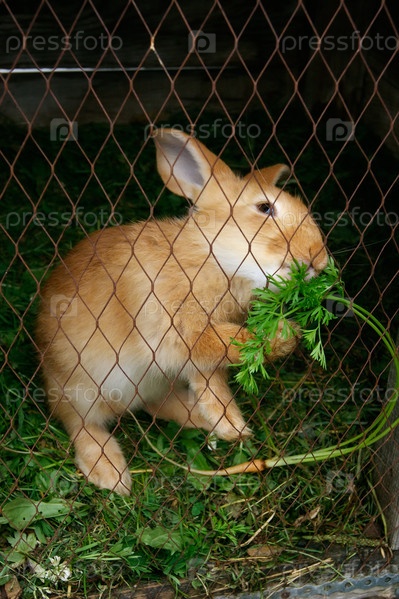 Кролик ест траву в клетке