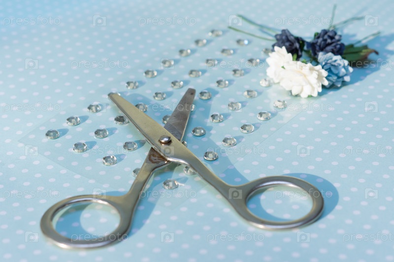 Ножницы, бумажные цветы и стразы на бумаге