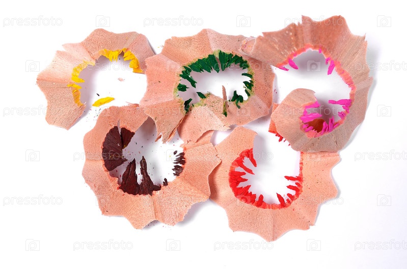 Стружка от цветных карандашей на белом фоне