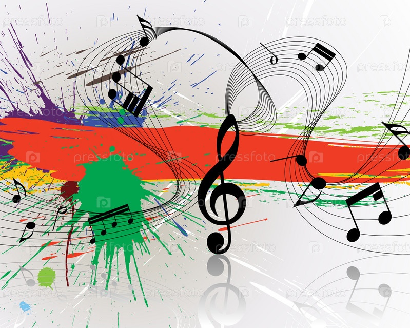 Музыкальные ноты и пятна краски на белом фоне
