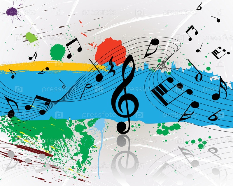 Музыкальные ноты и пятна краски на белом фоне