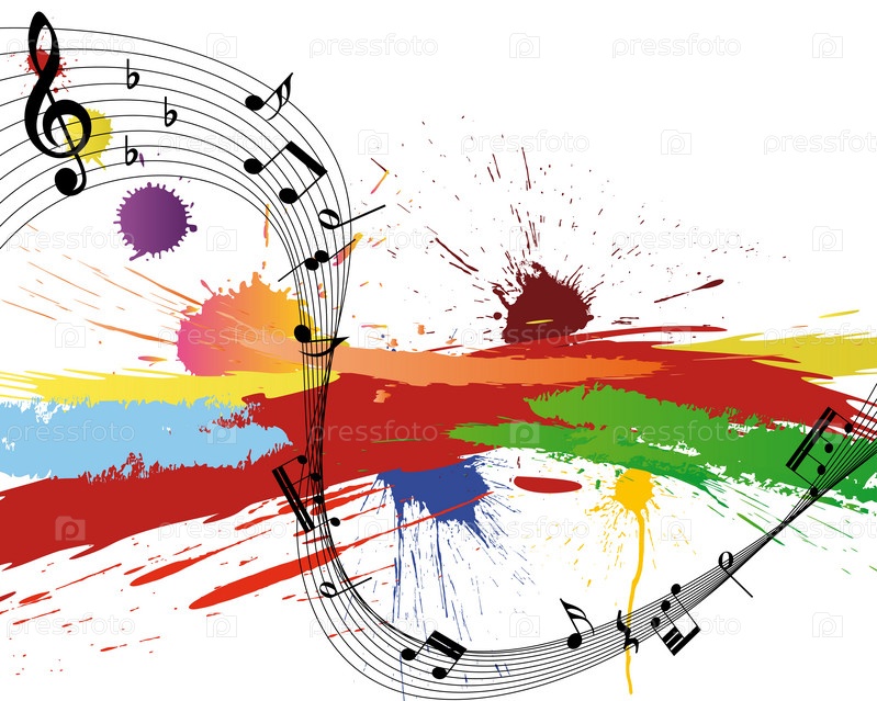 Музыкальные ноты и пятна краски на белом фоне
