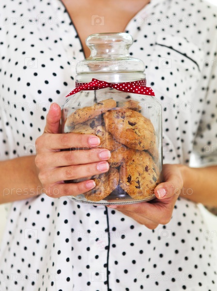 Женщина держит банку с печеньем