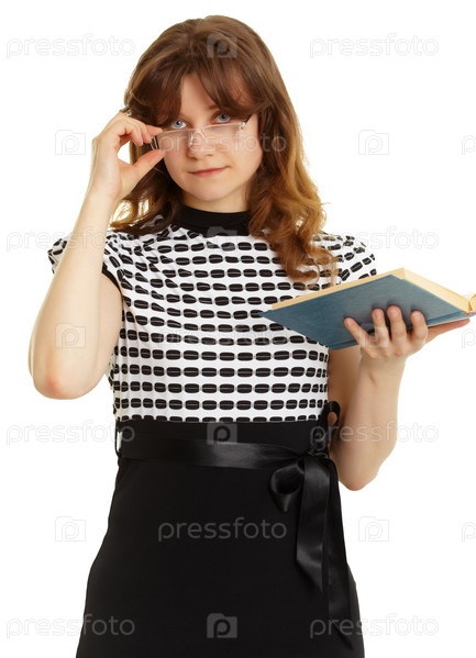 Молодая женщина в очках и с книгой на белом фоне