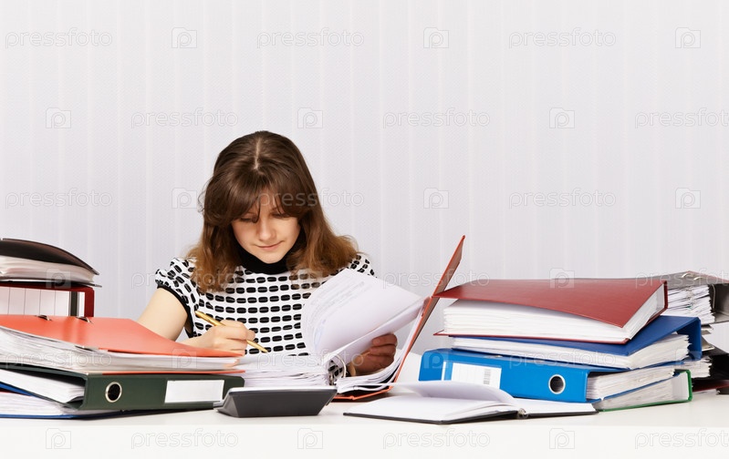Женщина и куча офисных папок на столе