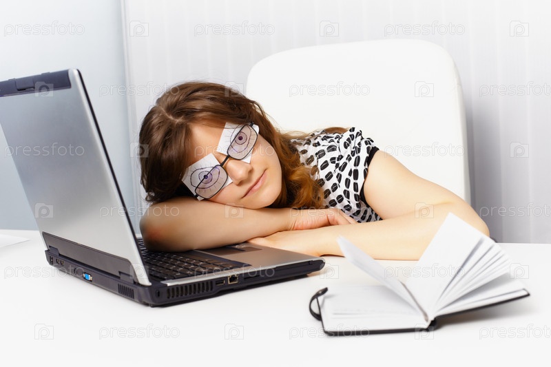 Женщина спит на рабочем месте в очках с изображением открытых глаз