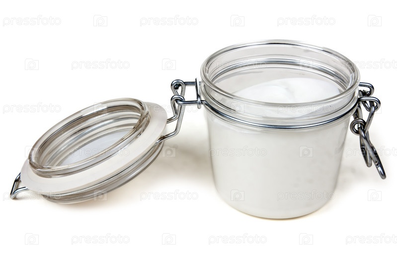 Банка с кремом со стальным замком на белом фоне