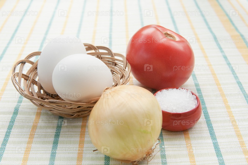Помидор, лук, соль и яйца на скатерти