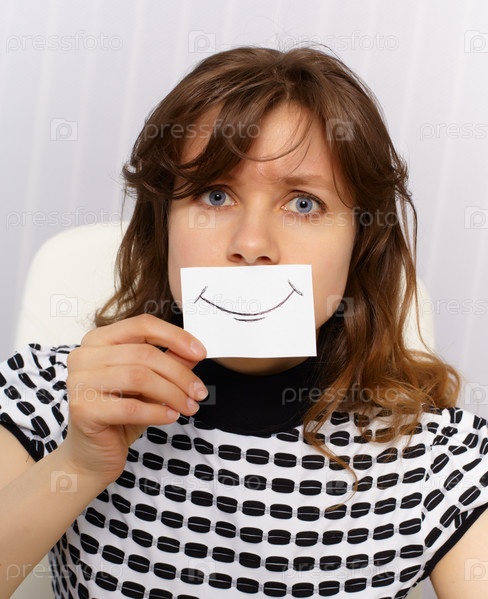 Несчастная женщина с приставленной к лицу бумажной улыбкой