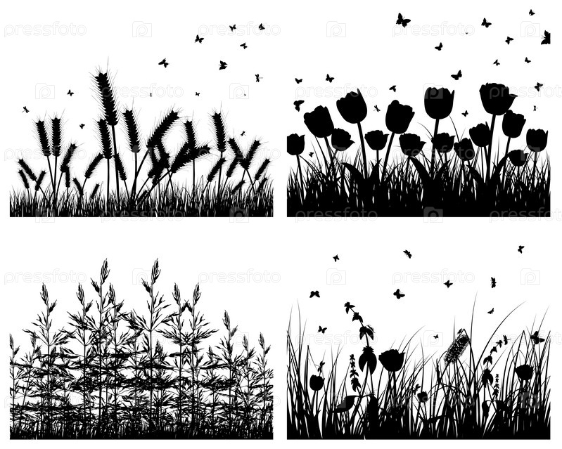 Набор травы и цветов на белом фоне