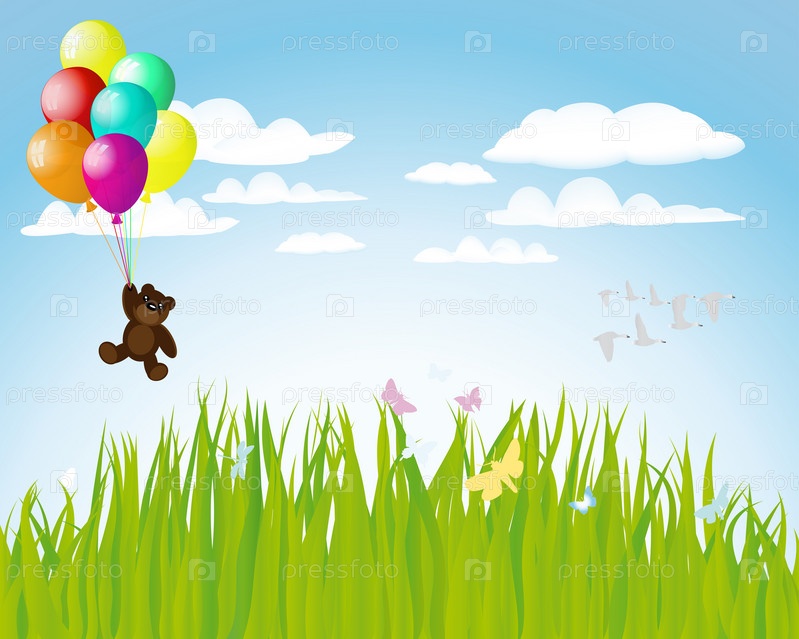 Плюшевый медведь летит на воздушных шарах