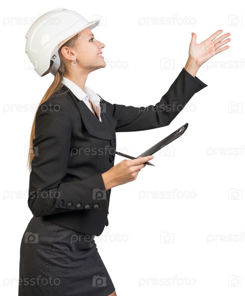 Бизнес-леди в каске указывает перед собой
