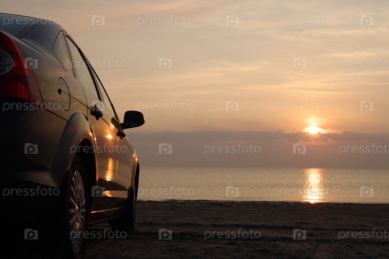 Легковой автомобиль на берегу океана на закате
