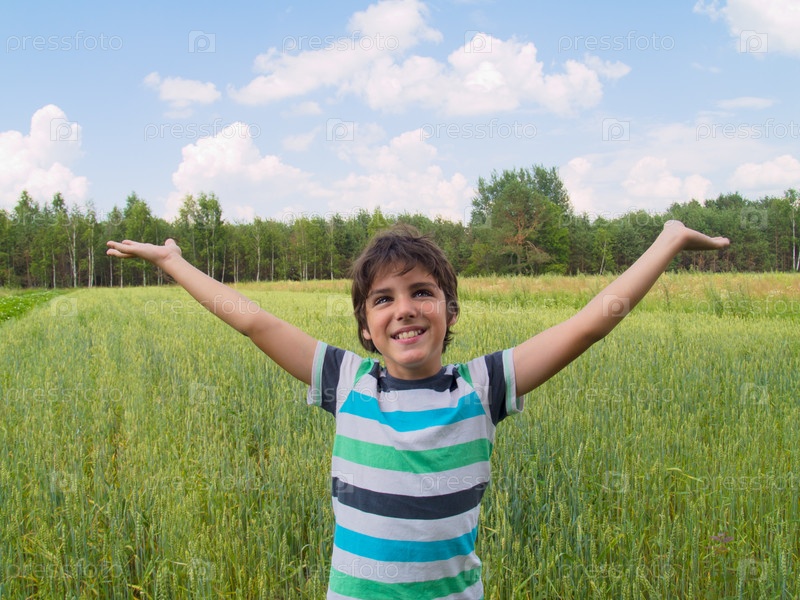 Счастливый мальчик на фоне пшеничного поля в летний день