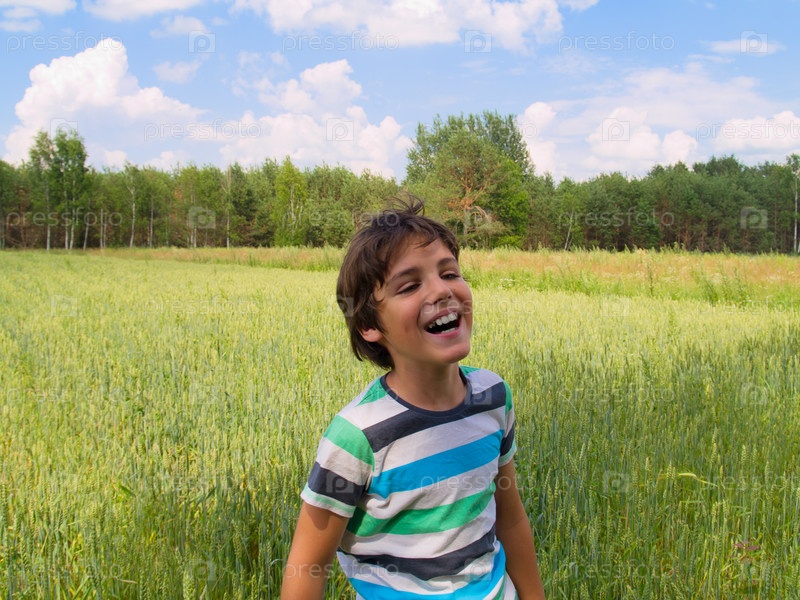Счастливый мальчик на фоне пшеничного поля в летний день