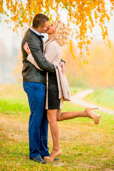 Молодая красивая пара позирует в парке
